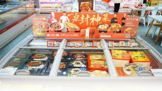商超货架上待售的综艺同款年菜。受访企业供图
