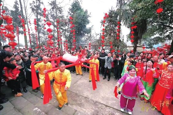 在成都市蒲江县,有一种年味叫年猪祭、幺妹灯。岁末年初,蒲江县甘溪镇箭塔村迎来第十届年猪祭活动。年猪祭开始前,幺妹灯艺人先行开道表演;年猪宴开席前,幺妹灯唱菜助兴,更添民俗趣味。