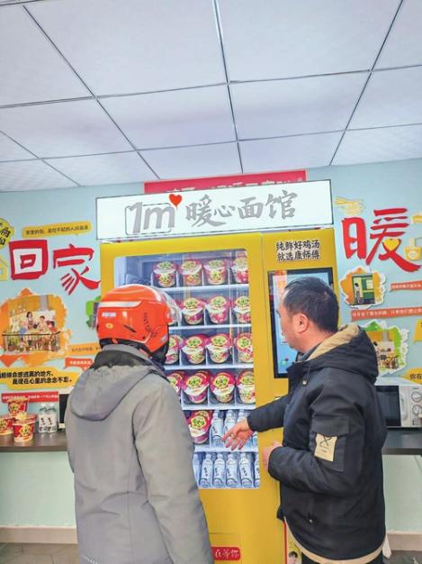 这个一平米的暖心面馆承载着多重功能:整齐码放的泡面、随时待机的热水装置,与驿站提供的便捷充电接口、舒适的临时歇脚区等共同构成一个“微而全”的治愈空间。尤其值得注意的是,面馆与驿站同步实现24小时开放,深夜奔波的外卖骑手只需扫码,即可领取一份热面与“喝开水”,在繁忙间隙暖身亦暖心。“以前半夜跑单,只能啃冷面包,现在能吃上热乎乎的汤面,感觉这座城市真的在关心我们。”一位骑手师傅的感慨,道出了众多新就业群体的心声。