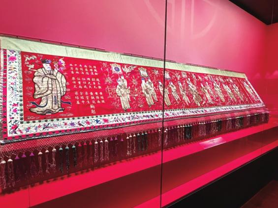 广州博物馆藏红缎排金绣人物纹贺寿横幅。