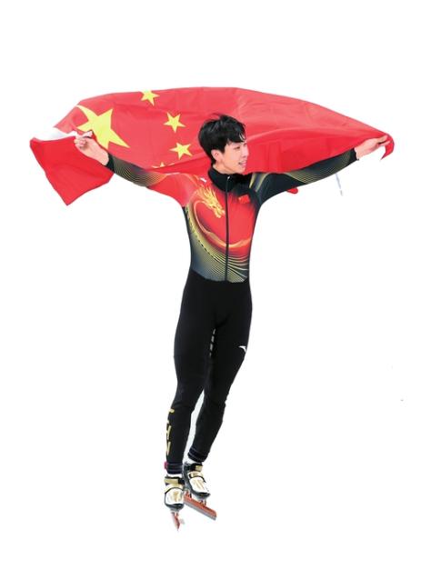 2月12日,孙龙在比赛后身披国旗庆祝。 新华社发