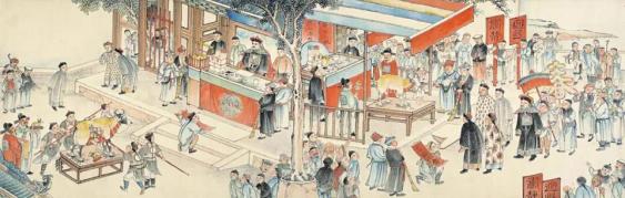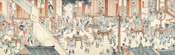 此外,画卷中还隐藏着更多生动年俗细节——游春队伍里,流行于川北的七节断尾龙灯在足盆鼓、包包锣等伴奏下欢腾起舞;纸扎彩灯“水八仙”栩栩如生;沿街商铺门贴春联、门神;街角小贩手摇拨浪鼓,孩童举着风车嬉戏追逐;身着棉袍的妇人手提贺年礼盒走亲访友……这些细碎而鲜活的情景,共同拼合出清代绵竹迎春盛会的完整画卷,让百年后的观者仍能感受当时街市的欢腾气息。