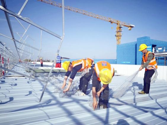 2月24日上午10点,在德阳北车辆段施工现场,部分区域已进入主体结构搭建阶段,登高车上,工人们正在建设幕墙,现场一派热火朝天。