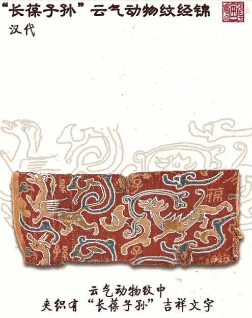 经锦,采用二重平纹组织,是汉代最高水平的丝织物。“长葆子孙”云气动物纹经锦,现藏于中国丝绸博物馆,色彩保存完好,纹样具有典型的汉代织锦特点,云气动物纹中夹织有“长葆子孙”隶书吉祥文字,体现了当时人们对荫及子孙的渴望。