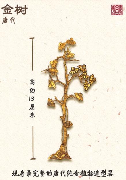 西安博物院藏的金树,高约13厘米,由主干、花朵和枝叶组成。主干上有树节,根部有长藤向树上盘绕,树干下部露出树根。树上的花朵原嵌有绿松石,金树绿花,劲枝柔藤,分外富丽。