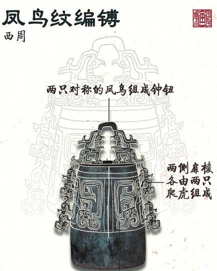 藏于陕西眉县博物馆的凤鸟纹编镈,整体为椭圆形。器物线条流畅,装饰图案华丽,纹饰构图巧妙严谨,整体厚重大气,是西周编镈中的精品。