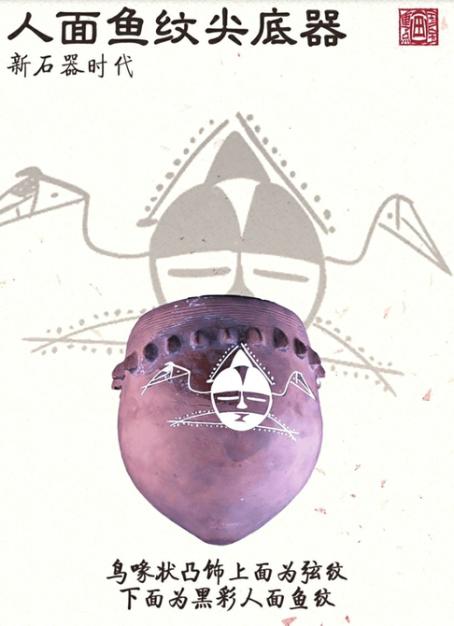 藏于西安半坡博物馆的人面鱼纹尖底器,人面呈圆形,有三角形发髻,用黑三角作眉,眼睛细而平直,似闭目状,耳侧向外平伸后向上弯曲,曲端连一条小鱼,神秘古朴。
