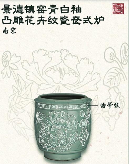 景德镇窑青白釉凸雕花卉纹瓷奁式炉藏于遂宁市博物馆,整体采用了剔花装饰,这种技法始见于北宋,有“留花剔地”和“留地剔花”两种。此器为“留花剔地”,先在坯体上敷一层化妆土,然后划出纹饰,再剔去花纹外多余部分的化妆土,露出素胎,最后再罩上一层透明釉烧成,花纹凸起产生浅浮雕的效果。