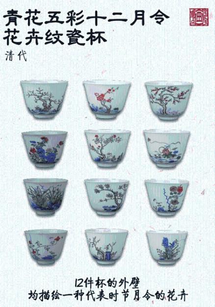 青花五彩十二月令花卉纹瓷杯藏于四川博物院,系景德镇官窑瓷器。12件杯组成一套,均为薄瓷胎,口微敞、深腹、圈足,每件杯的外壁描绘了一种代表时节月令的花卉。