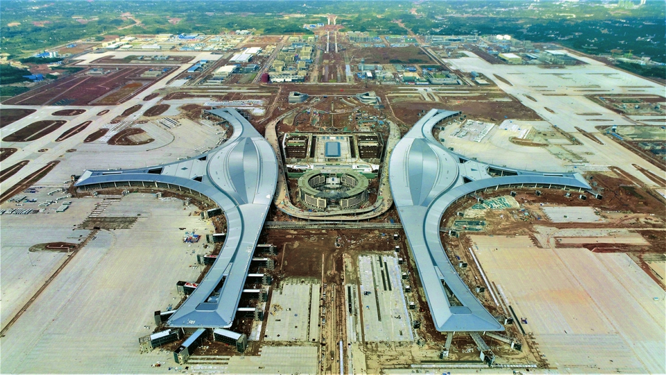 从天空向下俯瞰,成都天府国际机场航站楼宛若两只“驮日飞翔”的“神鸟”。这个设计源自金沙遗址出土的“太阳神鸟”,T1、T2航站楼与旅客过夜用房共同体现了“神鸟驮日展翅待飞”的寓意。