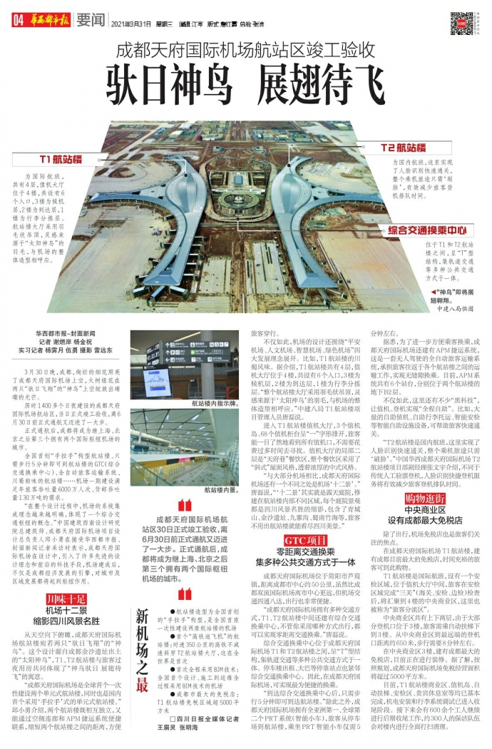 历时1400多个日夜建设的成都天府国际机场航站区,当日正式竣工验收,离6月30日前正式通航又迈进了一大步。
