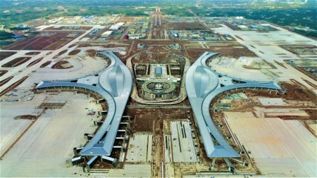 从天空向下俯瞰,成都天府国际机场航站楼宛若两只“驮日飞翔”的“神鸟”。这个设计源自成都金沙遗址出土的“太阳神鸟”,T1、T2航站楼与旅客过夜用房共同体现了“神鸟驮日 展翅待飞”的寓意。