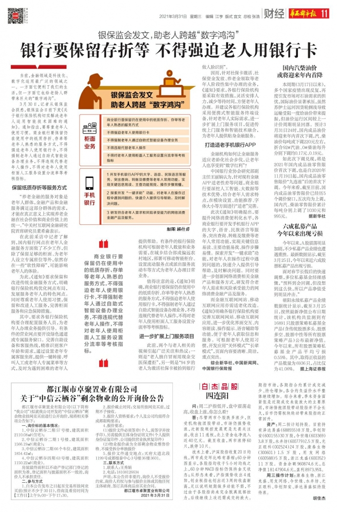 3月30日,记者从银保监会获悉,银保监会日前下发《关于银行保险机构切实解决老年人运用智能技术困难的通知》。通知指出,要尊重老年人使用习惯。商业银行要保留仍在使用中的纸质存折、存单等老年人熟悉的服务方式,不得强迫老年人使用银行卡,不得强制老年人通过自助式智能设备办理业务,不得违规代替老年人操作,不得对老年人使用柜面人工服务设置分流率等考核指标。