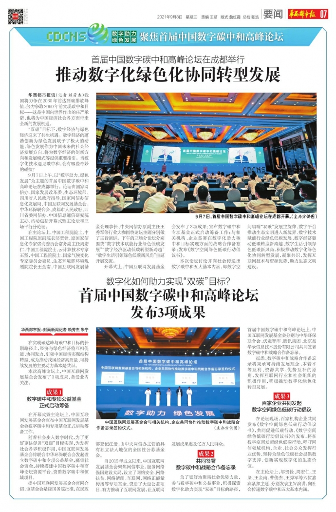 随着社会步入数字时代,为了更好更快促进“双碳”目标实现,为发挥社会各界积极作用,中国互联网发展基金会将联合中华环保联合会发起设立数字碳中和专项公益基金,募集社会资金,持续搭建中国数字碳中和高峰论坛资源平台,资助数字碳中和领域项目。