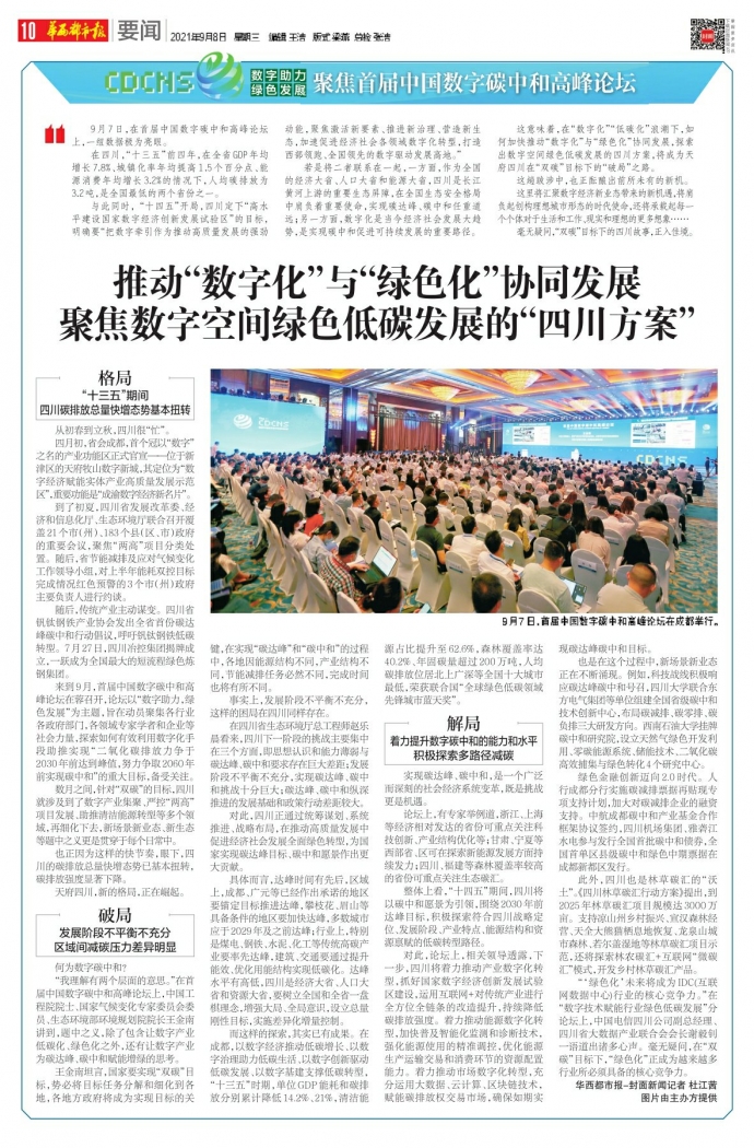 若是将二者联系在一起,一方面,作为全国的经济大省、人口大省和能源大省,四川是长江黄河上游的重要生态屏障,在全国生态安全格局中肩负着重要使命,实现碳达峰、碳中和任重道远;另一方面,数字化是当今经济社会发展大趋势,是实现碳中和促进可持续发展的重要路径。