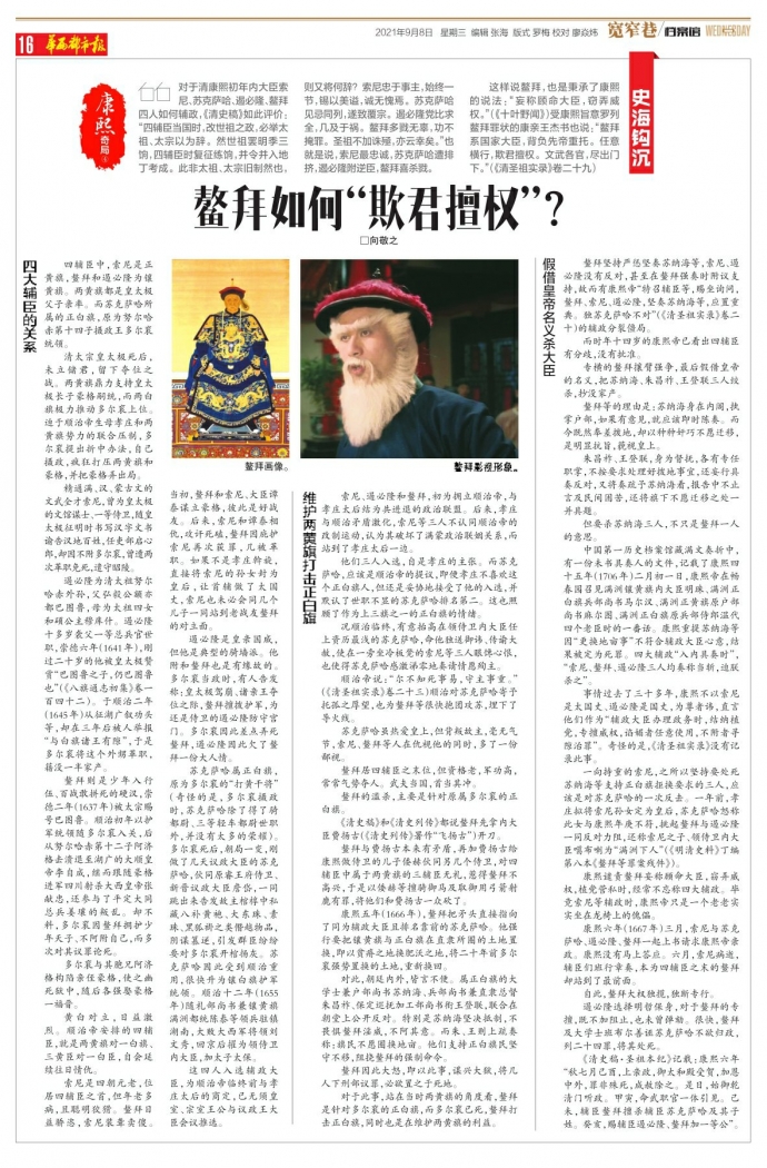 这样说鳌拜,也是秉承了康熙的说法:“妄称顾命大臣,窃弄威权。”(《十叶野闻》)受康熙旨意罗列鳌拜罪状的康亲王杰书也说:“鳌拜系国家大臣,背负先帝重托。任意横行,欺君擅权。文武各官,尽出门下。”(《清圣祖实录》卷二十九)