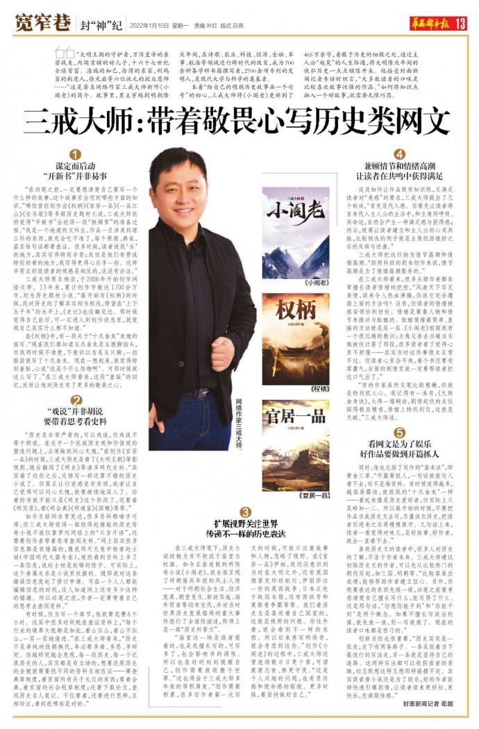 三戒大师原名杨浩,于2008年开始创作网络文学。13年来,累计创作字数达1700余万字,均为历史题材小说。“最开始写《权柄》的时候,我对历史的了解其实相当粗浅,停留在‘上下五千年’的水平上,《史记》也没翻完过。那时候觉得自己能写,可一旦进入到创作状态里,就发现自己其实什么都不知道。”