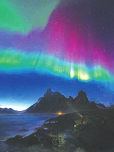 绿色极光是最常见的极光,北欧极光也大多是绿色极光。绿色极光的形成,通常是太阳风在大约96千米至241千米的高度,与大气中氧气碰撞出来的产物。朱进介绍,极光的颜色和强度取决于沉降粒子的能量和数量。“如果你是在地球的两极看到极光,那么看到的绿色、蓝色就比较多。但如果是在低纬度地区,能看到的极光往往是偏白色或者是偏红色、粉色,以及红色这样的极光比较多。”朱进说,黄色和粉红色极光在自然界中并不多见,只有在太阳剧烈活动时,人们有可能会看到这两种颜色。