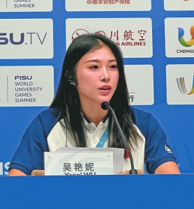 7月28日上午,成都大运会召开赛前新闻发布会,吴艳妮作为运动员代表发言。
