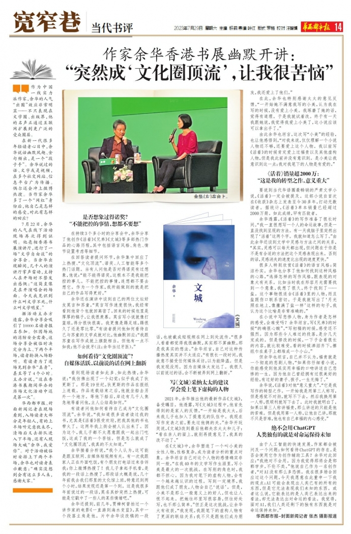 看到现场读者如此多、如此热情,余华说:“我仿佛出现了一个幻觉:似乎我成了狄更斯了。那是19世纪,狄更斯的作品在报纸上连载。作品连载结束之后,他就坐船去另外一个地方。等他下船后,岸边有几千人焦急地等着问他,主人公结局如何。”