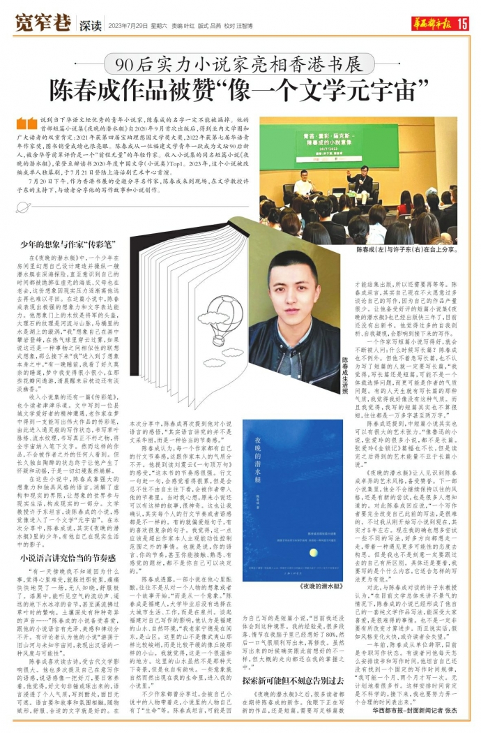 7月20日下午,作为香港书展的受邀分享名作家,陈春成来到现场,在文学教授许子东的主持下,与读者分享他的写作故事和小说创作。