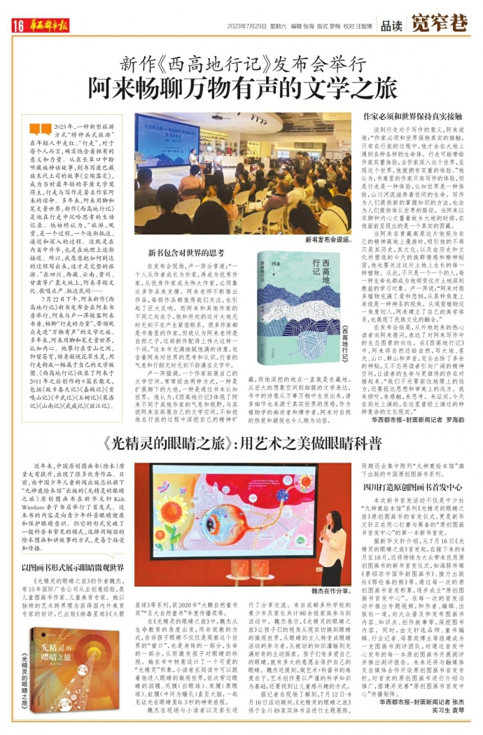 在发布会结尾,从外地赶来的热心读者向阿来提问,表达了对阿来写作中的生态图景的向往。在《西高地行记》中,阿来将自然还给自然,写大地、星光、山口、群山和声音,完全去除了多余的神秘,又不忘将读者引向广阔的精神空间,让读者的生命与更雄伟的存在对接起来。“我们不光要前往地理上的远方,还要抵达思想和审美上的远方。我来倾听,来感触,来思考。来证实,今天在别处上演的,在这里曾经上演过的种种复杂的文化现实。”
