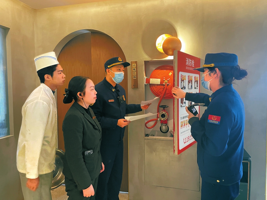 1月29日中午,成都锦江区消防救援大队监督执法人员在华兴街进行火灾隐患巡查。在一家中餐店,执法人员发现店内消防栓不能正常出水。 苟春摄