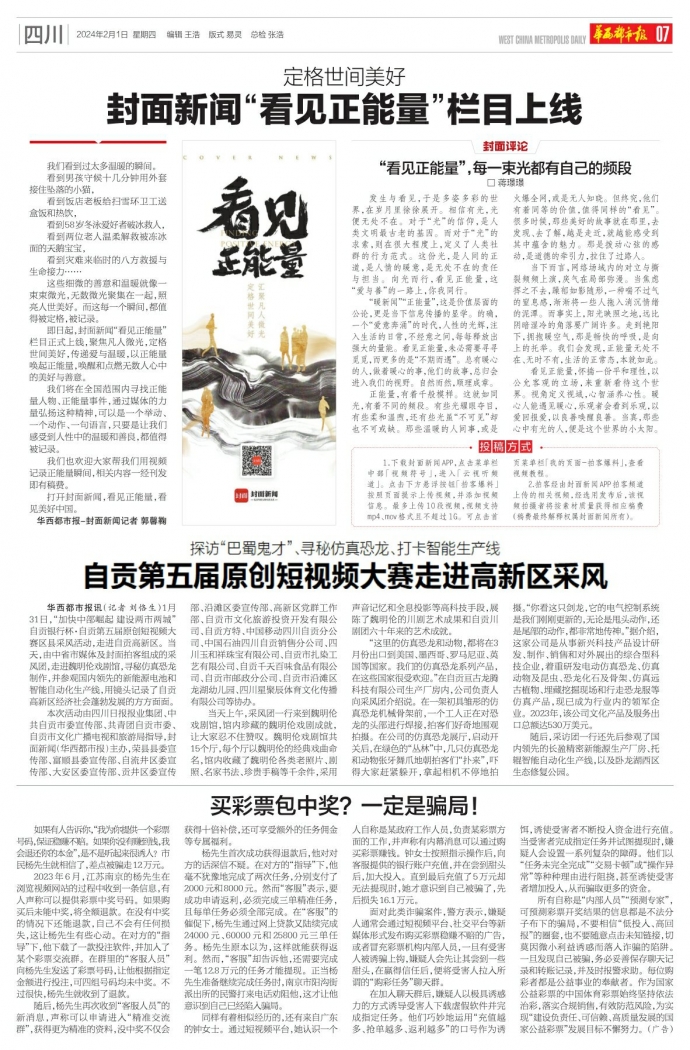 华西都市报讯(记者 刘恪生)1月31日,“加快中部崛起建设两市两城”自贡银行杯·自贡第五届原创短视频大赛区县采风活动,走进自贡高新区。当天,由中省市媒体及封面拍客组成的采风团,走进魏明伦戏剧馆,寻秘仿真恐龙制作,并参观国内领先的新能源电池和智能自动化生产线,用镜头记录了自贡高新区经济社会蓬勃发展的方方面面。