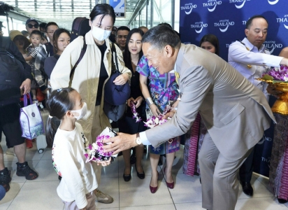 2023年9月25日,泰国总理赛塔·他威信(前排右)在曼谷素万那普国际机场迎接中国游客。 图据新华社客户端