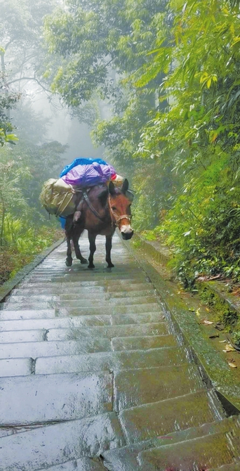 需要上山的货物,由车辆运至海拔1000米左右的万年寺鞍子口,交付给骡队,骡队从万年寺朝着息心所方向,经初殿、华严顶,到达海拔约1900米的九岭岗。