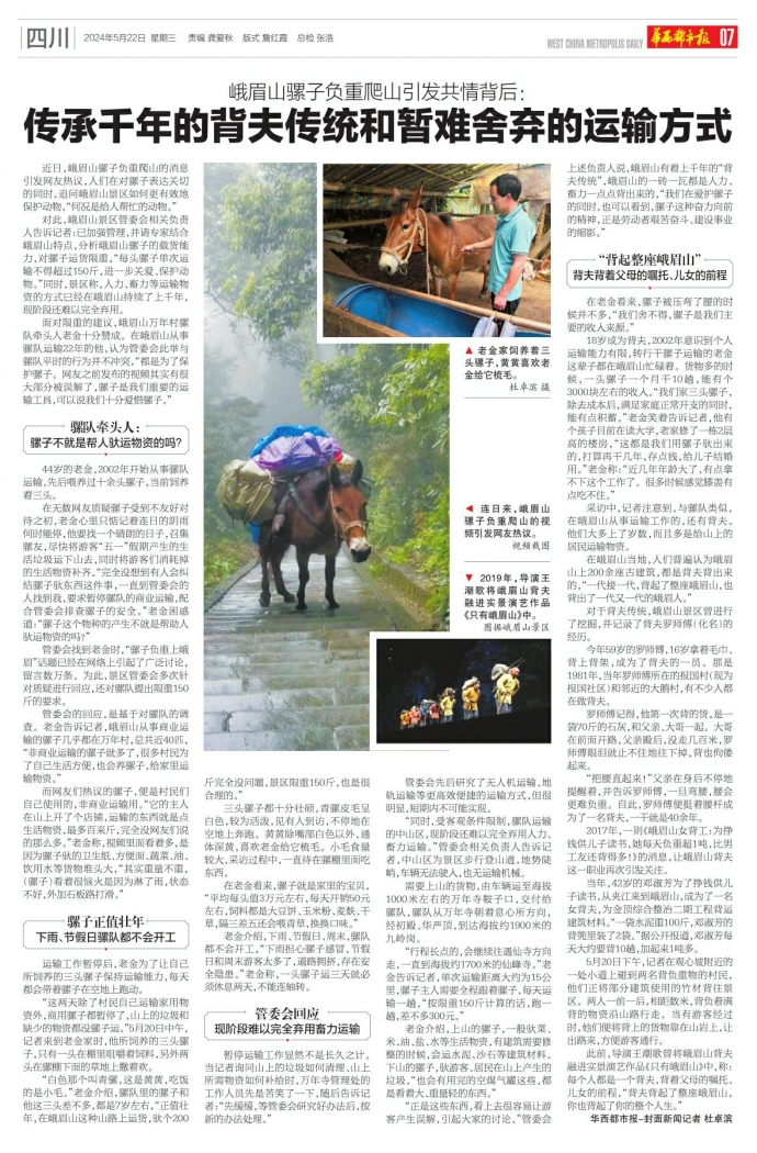 管委会找到老金时,“骡子负重上峨眉”话题已经在网络上引起了广泛讨论,留言数万条。为此,景区管委会多次针对质疑进行回应,还对骡队提出限重150斤的要求。