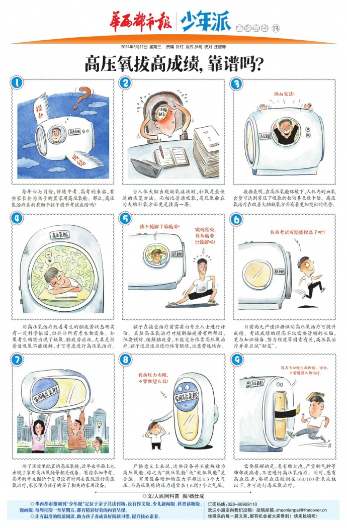 每年六七月份,伴随中考、高考的来临,有些家长会为孩子购置家用高压氧舱。那么,高压氧治疗真的有助于孩子提升考试成绩吗?