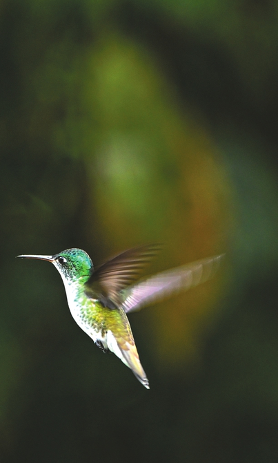 拍摄普通鸟类时,可能1/500到1/1000秒的快门速度就能拍摄,但拍摄蜂鸟必须考虑它的翅膀扇动速度,所以需要更加高速的快门,达到1/2000秒以上,才能完整捕捉到蜂鸟的飞行动作和扇动翅膀的细节。