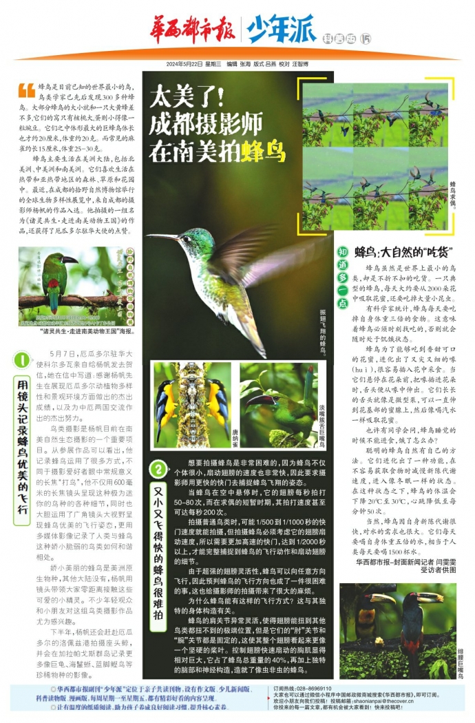 娇小美丽的蜂鸟是美洲原生物种,其他大陆没有,杨帆用镜头带领大家零距离接触这些可爱的小精灵。不少年轻观众和小朋友对这组鸟类摄影作品尤为感兴趣。