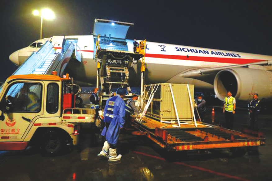 4月3日晚,旅韩大熊猫“福宝”搭乘包机抵达成都双流国际机场。 新华社发