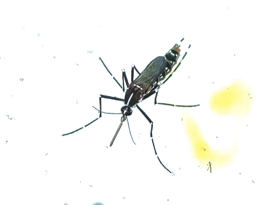 白纹伊蚊是四川最常见的伊蚊属代表,因其凶猛又被称为“亚洲虎蚊”,它们体型小,通体黑色,间有白斑,中胸背板上有一条明显的白色纵纹,后足各跗节上均有白环。常见于5至10月,主要在白天至黄昏活动,是登革热传播的主要媒介之一。