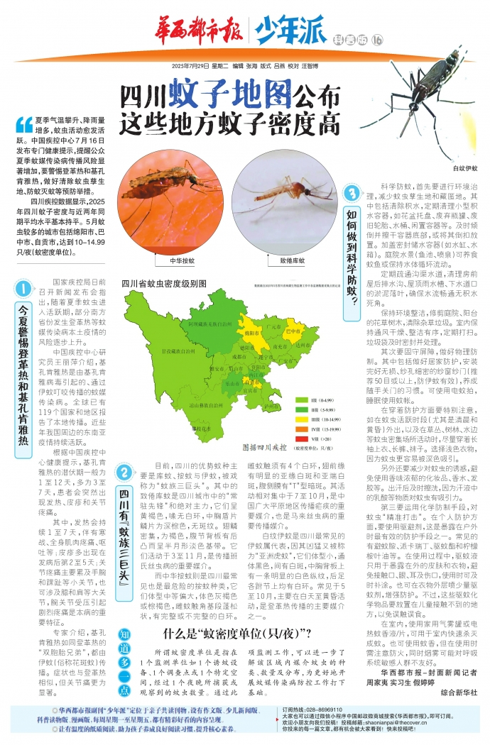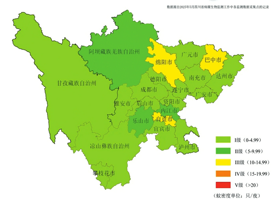 四川疾控数据显示,2025年四川蚊子密度与近两年同期平均水平基本持平。5月蚊虫较多的城市包括绵阳市、巴中市、自贡市,达到10-14.99只/夜(蚊密度单位)。