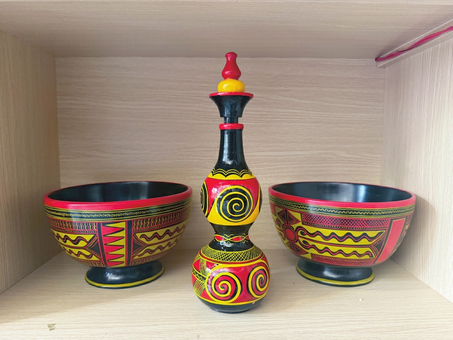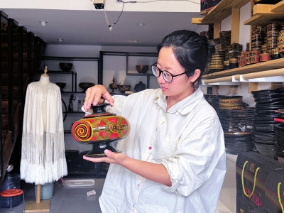 8月中旬,初秋的风掠过大凉山西昌市的建昌古城,在上西街边,曲木史伍在家里的漆器批发店里坐着,擦拭着柜台上红、黄、黑三色绘成的彝族漆器。
