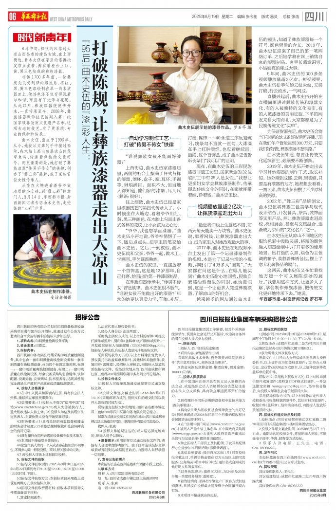 这两天,曲木史伍又在忙着找地方建一个可以展陈漆器的展厅。“我想用这种方式,让更多人了解、学会制作彝族漆器,把传统文化更好地传承下去。”她说。