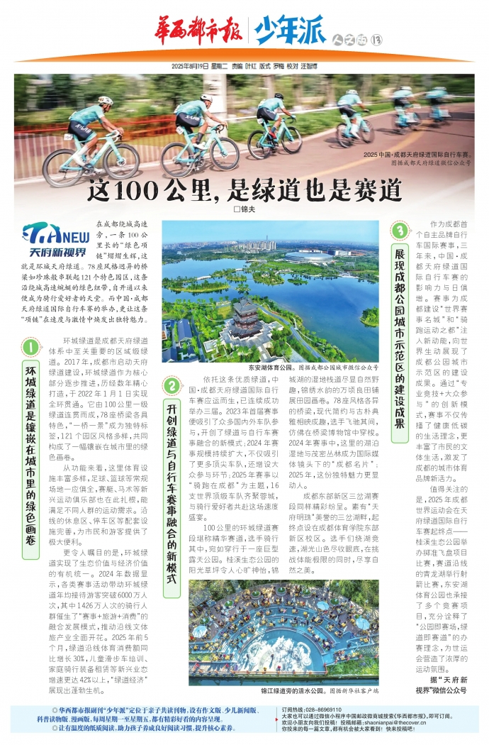 作为成都首个自主品牌自行车国际赛事,三年来,中国·成都天府绿道国际自行车赛的影响力与日俱增。赛事为成都建设“世界赛事名城”和“骑跑运动之都”注入新动能,向世界生动展现了成都公园城市示范区的建设成果。通过“专业竞技+大众参与”的创新模式,赛事不仅传播了健康低碳的生活理念,更丰富了市民的文体生活,激发了成都的城市体育品牌新活力。