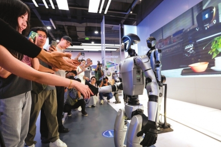 北京经开区机器人大世界的全球首个具身智能机器人4S店(ROBOT MALL)内,观众在与一款人形机器人握手。