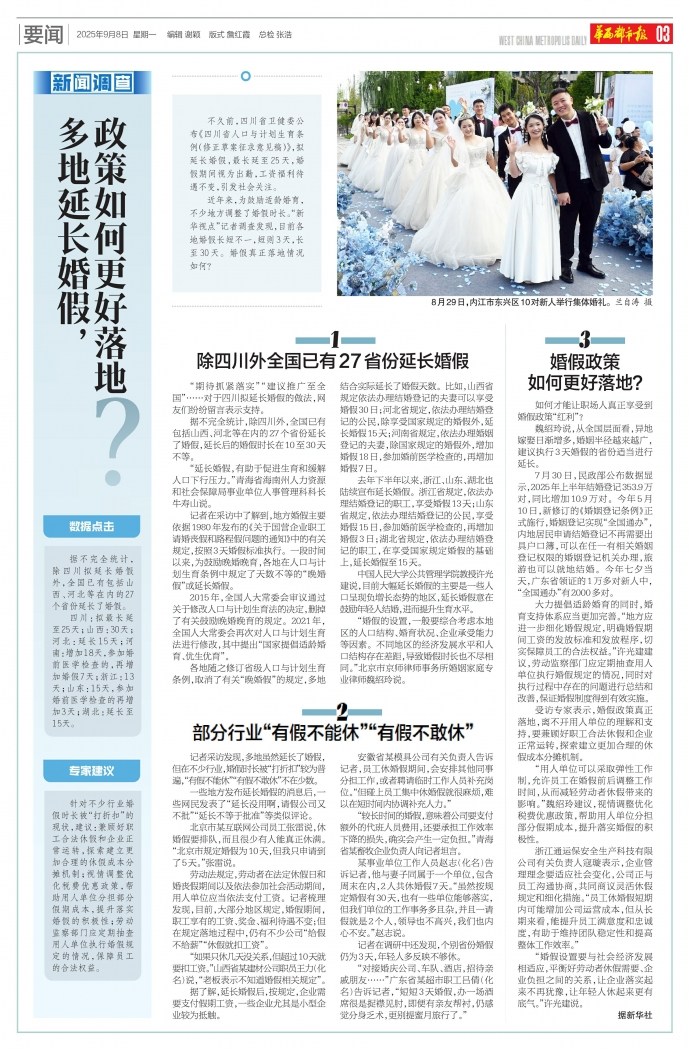 据不完全统计,除四川拟延长婚假外,全国已有包括山西、河北等在内的27个省份延长了婚假。