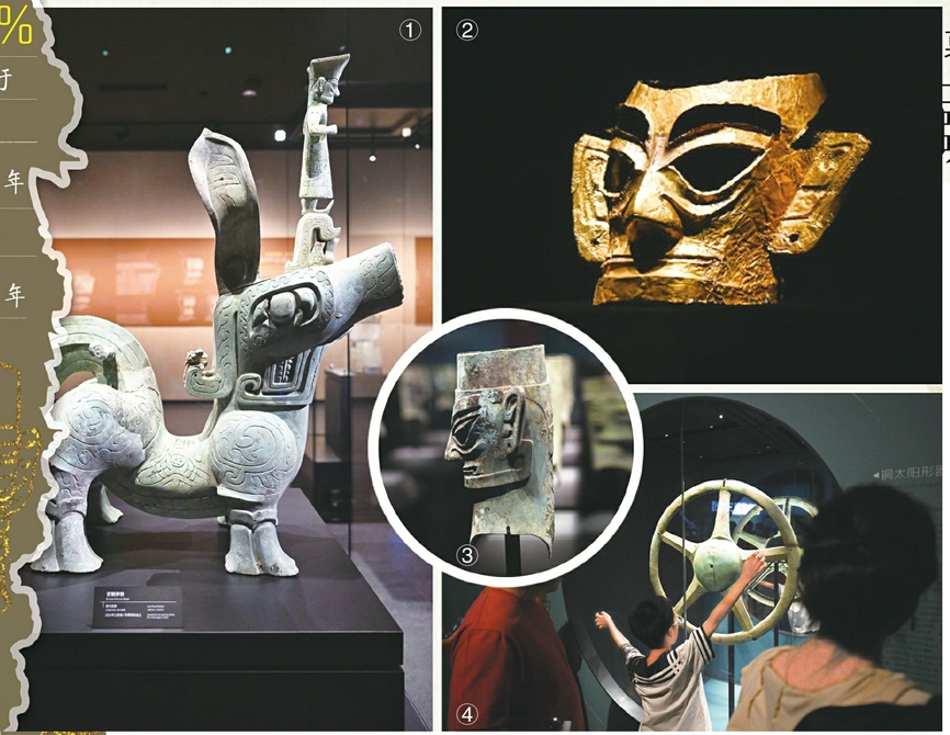 ①三星堆青铜神兽。②三星堆金面具。③三星堆辫发青铜人头像。④观众在观看三星堆铜太阳形器。