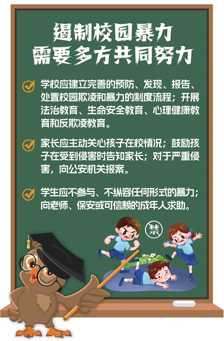 遏制校园暴力,需要学校、家庭、学生共同努力。对于学校来说,应该健全机制,建立完善的预防、发现、报告、处置校园欺凌和暴力的制度流程;常态化开展法治教育、生命安全教育、心理健康教育和反欺凌教育,提升学生规则意识、自护能力和求助意识。同时,积极构建友善、平等、互助的校园文化,设立便捷、保密的举报途径。