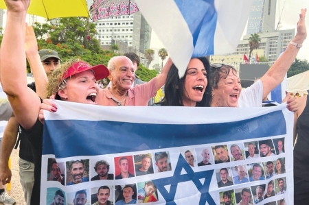 10月9日,以色列被扣押人员亲友在特拉维夫庆祝达成停火协议。 新华社发