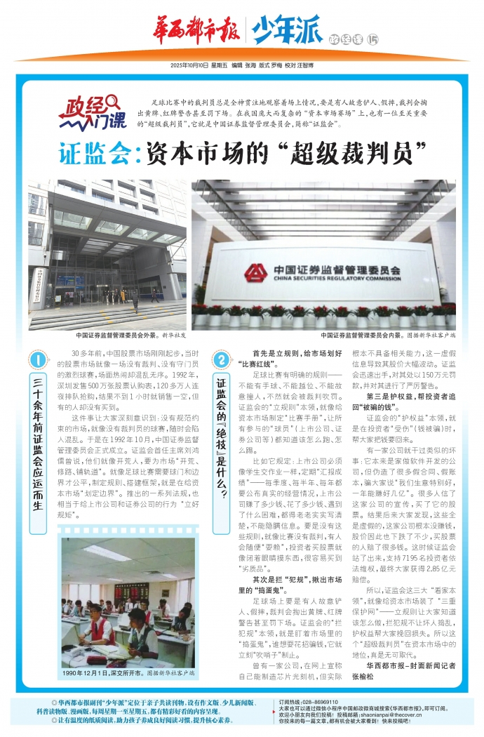足球比赛中的裁判员总是全神贯注地观察着场上情况,要是有人故意铲人、假摔,裁判会掏出黄牌、红牌警告甚至罚下场。在我国庞大而复杂的“资本市场赛场”上,也有一位至关重要的“超级裁判员”,它就是中国证券监督管理委员会,简称“证监会”。