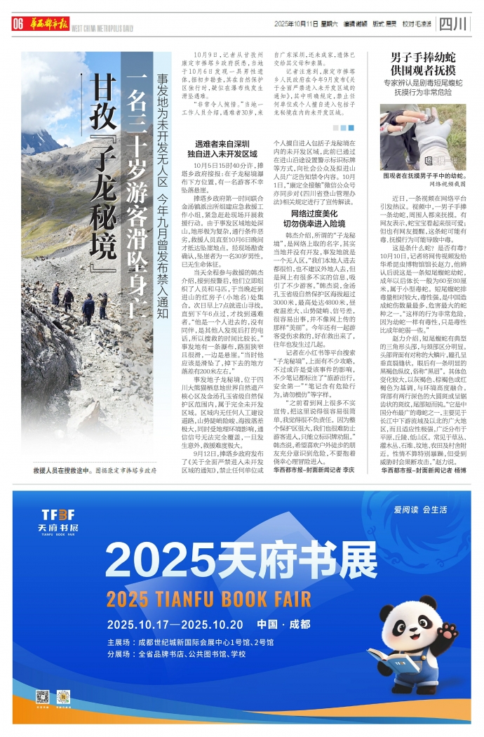 韩杰介绍,所谓的“子龙秘境”,是网络上取的名字,其实当地并没有开发,事发地就是一个无人区。“我们本地人进去都很怕,也不建议外地人去,但是网上有很多不实的信息,吸引了不少游客。”韩杰说,金汤孔玉省级自然保护区海拔超过3000米,最高处达4800米,昼夜温差大、山势陡峭、信号差,很容易出事,并不像网上传的那样“美丽”。今年还有一起游客受伤求救的,好在救出来了,往年也发生过几起。