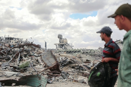 10月12日,在加沙地带南部汗尤尼斯,重返家园的巴勒斯坦人走过严重受损的建筑。新华社发