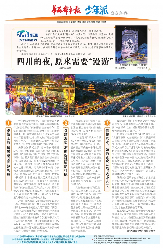爆款夜游模式上新,赴一场夜间精神SPA。国庆中秋假期,四川多地夜游上新,解锁越“夜”越美丽。9月28日晚,《望江梦华·薛涛吟》公园实景沉浸式夜游在成都市望江楼公园重磅首演。孔雀啼鸣,掌灯而舞,随诗入梦,一场夜游,唐朝“女校书”薛涛传奇的一生徐徐展开。南充阆中《客来阆中》夜游演艺焕新升级,国庆中秋假期首秀。夜色里,杜甫与阆中刺史王邕江上宴饮,亦有阆中民俗风情、非遗技艺融入历史场景,流动的画舫,轻轻“闯进”千年前文人与山水的浪漫邂逅。雅安推出的“游青衣羌江,品光影雅安”夜游主题,运用声、光、水、电、雾等元素,勾勒出梦幻的夜航画卷。当艺术叙事对上大众旅游消费口味,一场场“行走的戏剧”,带观众走入故事中的角色。