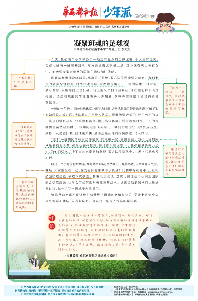 作文围绕一场足球比赛展开,条理清晰,层次分明。对场上队员的动作、状态描写生动,如运用比喻的修辞手法展现队员的灵活,让读者仿佛身临其境。同时,注重对场边同学反应的描写,从侧面烘托出比赛的激烈氛围。赛后同学们积极分析不足、互相鼓励的情节,进一步体现了班级的团结精神。结尾总结比赛带来的收获,升华了主题。语言流畅自然,是一篇不错的记叙文。